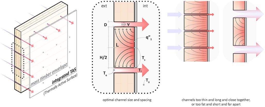 Ces dernières années, les expérimentations menées par Salmaan Craig4 et Rural Studio5 sur les systèmes dynamiques ont connu un regain d’intérêt. Un exemple est la conception de panneaux de bois massif comme échangeurs de chaleur. Le principe consiste à introduire des canaux d’air dans le solide du bois et à optimiser leur taille et leur espacement, de sorte que la conduction sortante chauffe l’air entrant. Leurs ambitions sont la simplification radicale de la conception des bâtiments en bois afin de réduire les émissions de carbone intrinsèques et opérationnelles, et de démontrer qu’il est possible d’obtenir de faibles pertes thermiques sans isolation extérieure.