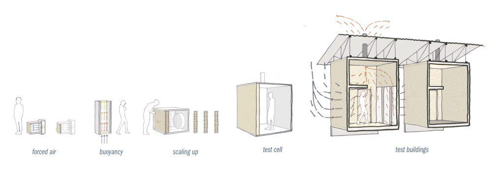Panneau de bois comme échangeur de chaleur. Les corrélations de conception ont été initialement développées pour des applications aérospatiales. Travaux de recherche de Salman Craig, Kiel Moe et Rural Studio, The design of mass timber panels as heat-exchangers (Dynamic Insulation). – Sources : illustration du haut https://www.frontiersin.org/journals/built-environment/articles/10.3389/fbuil.2020.606258/full et illustration du bas https://ruralstudio.org/category/recently-completed/breathing-wall-mass-timber-research/